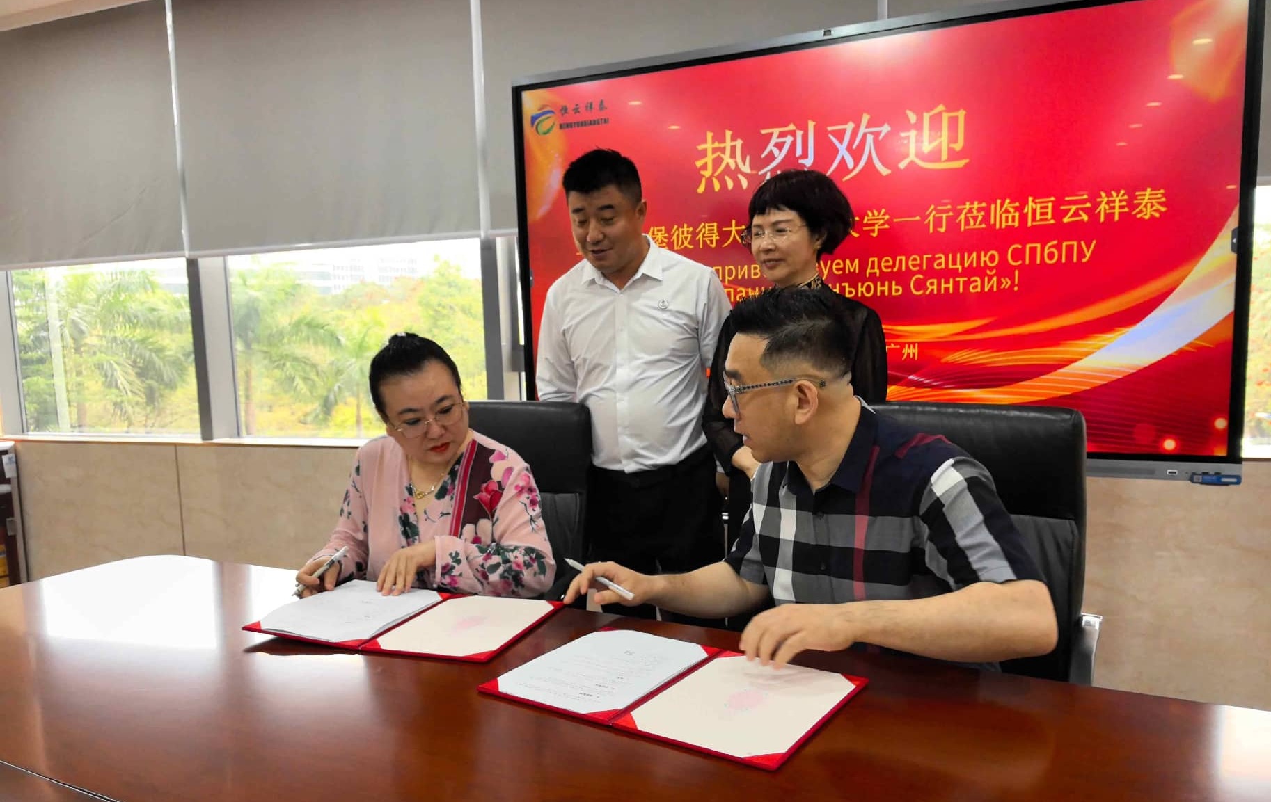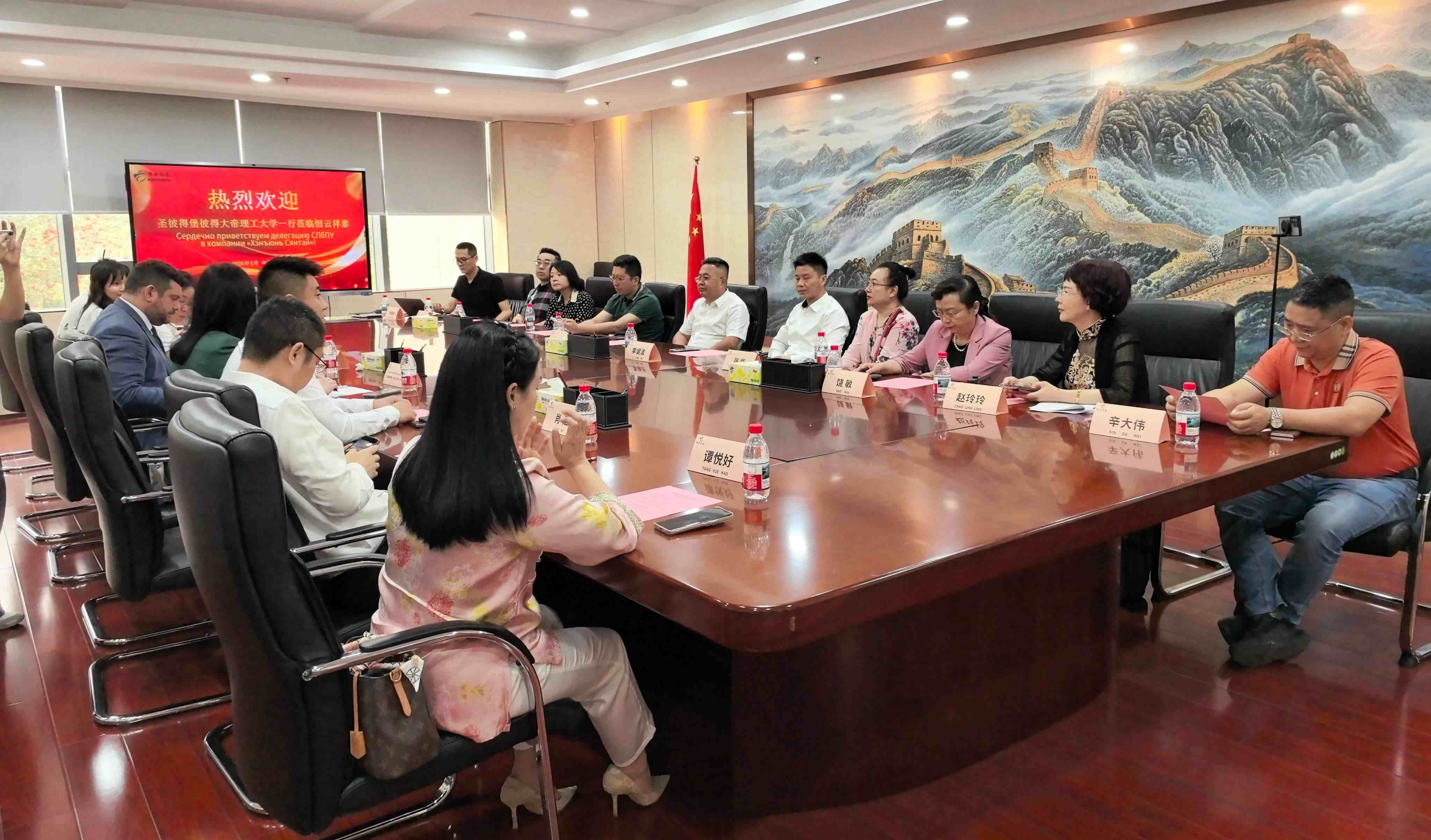 本次会议于当日10:00在恒云祥泰会议室拉开帷幕。广东恒云祥泰教育科技有限公司董事长杨瑞海、圣彼得堡彼得大帝理工大学副校长及俄语语言中心主任、广东省南方人才发展研究院专委会主任饶敏、执行院长高翔、顾问赵玲玲等三方代表主席了活动。