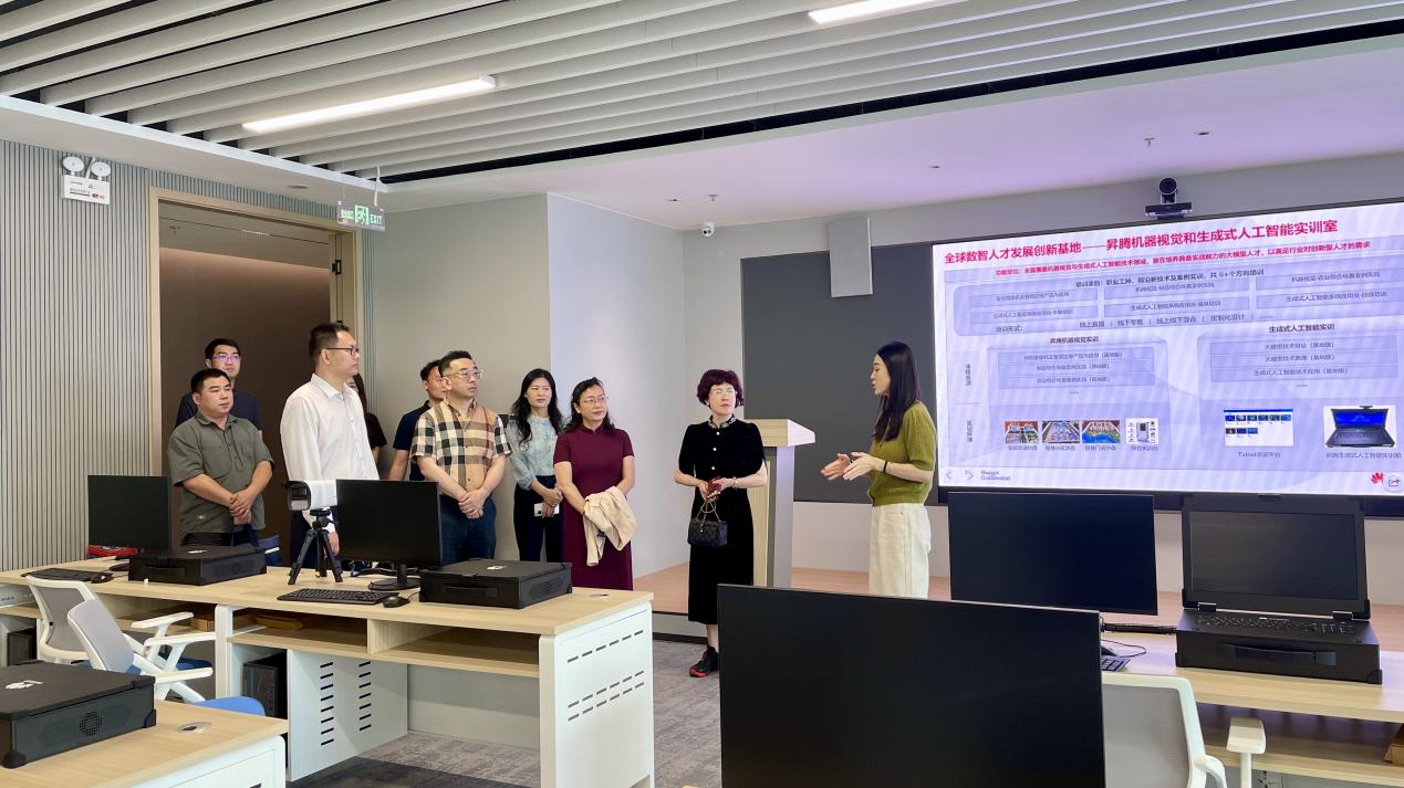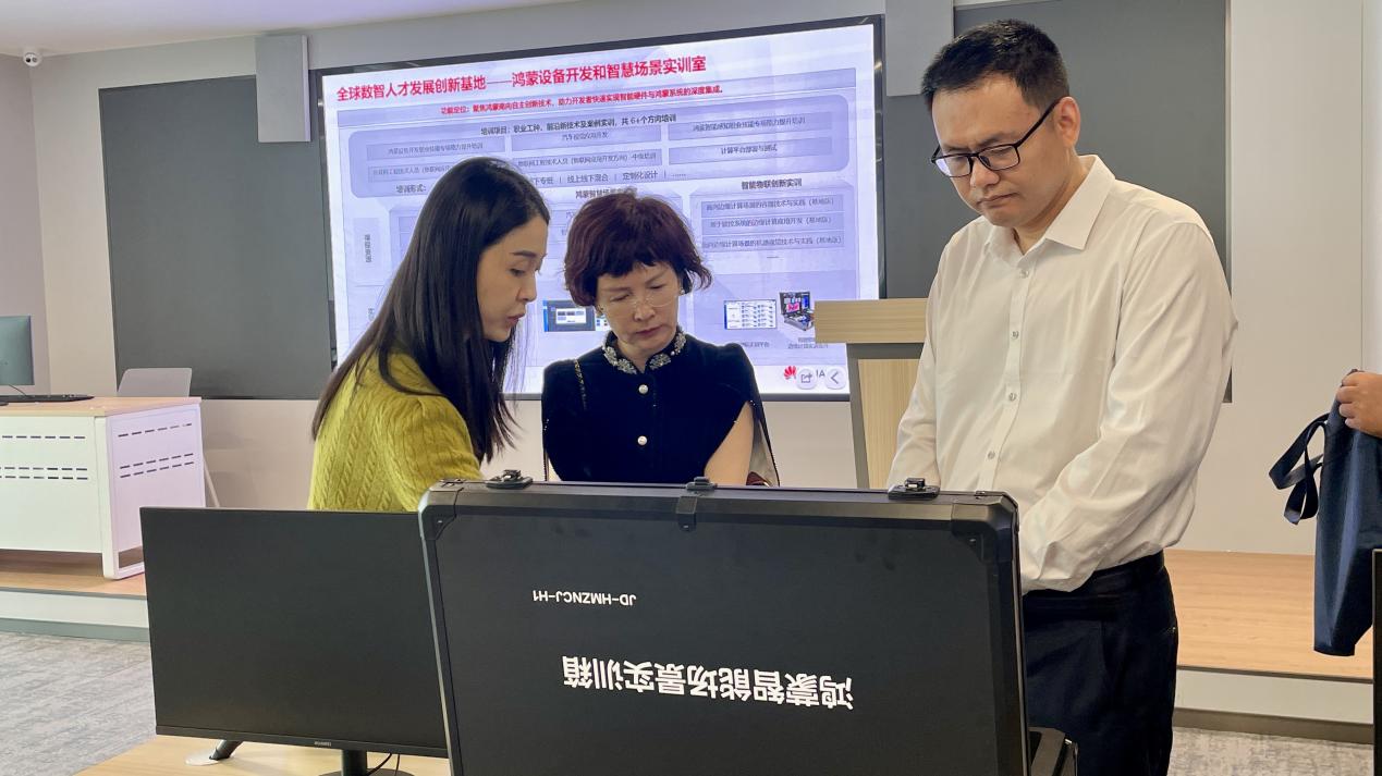 随后,调研组深入实训区域,实地考察基地在数智人才培养方面的具体实践。基地围绕鸿蒙、昇腾及新一代互联技术三大方向,构建了涵盖移动应用开发、设备开发及智慧场景应用在内的多元化实训体系,配备多个专业实训教室及丰富的培训项目,并引入“VUE考试中心”等标准化评价平台。依托华为“22+1”全栈ICT技术培训与认证体系,基地形成了“招生—培训—考试—认证—就业/创业—标准输出”的全链条人才发展模式,实现了人才培养与产业需求的高效衔接。